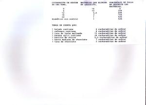 Un efecto indeseable del azúcar en el organismo es que destruye la capacidad de lucha de los glóbulos blancos (leucocitos) por lo que nos expone a contraer y caer víctimas de enfermedades infecciosas pues los glóbulos blancos son los encargados de las defensas en el organismo.  La siguiente tabla nos muestra el efecto que tiene sobre los leucocitos el azúcar, reduciéndoles la capacidad de lucha.